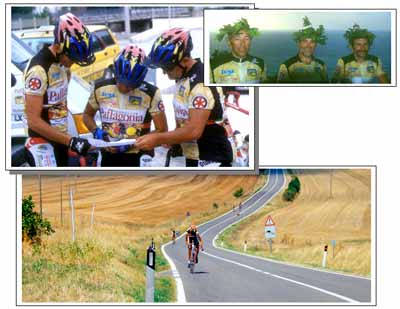 ciclisti incoronati di alloro dopo una tappa molto dura, sulle coste